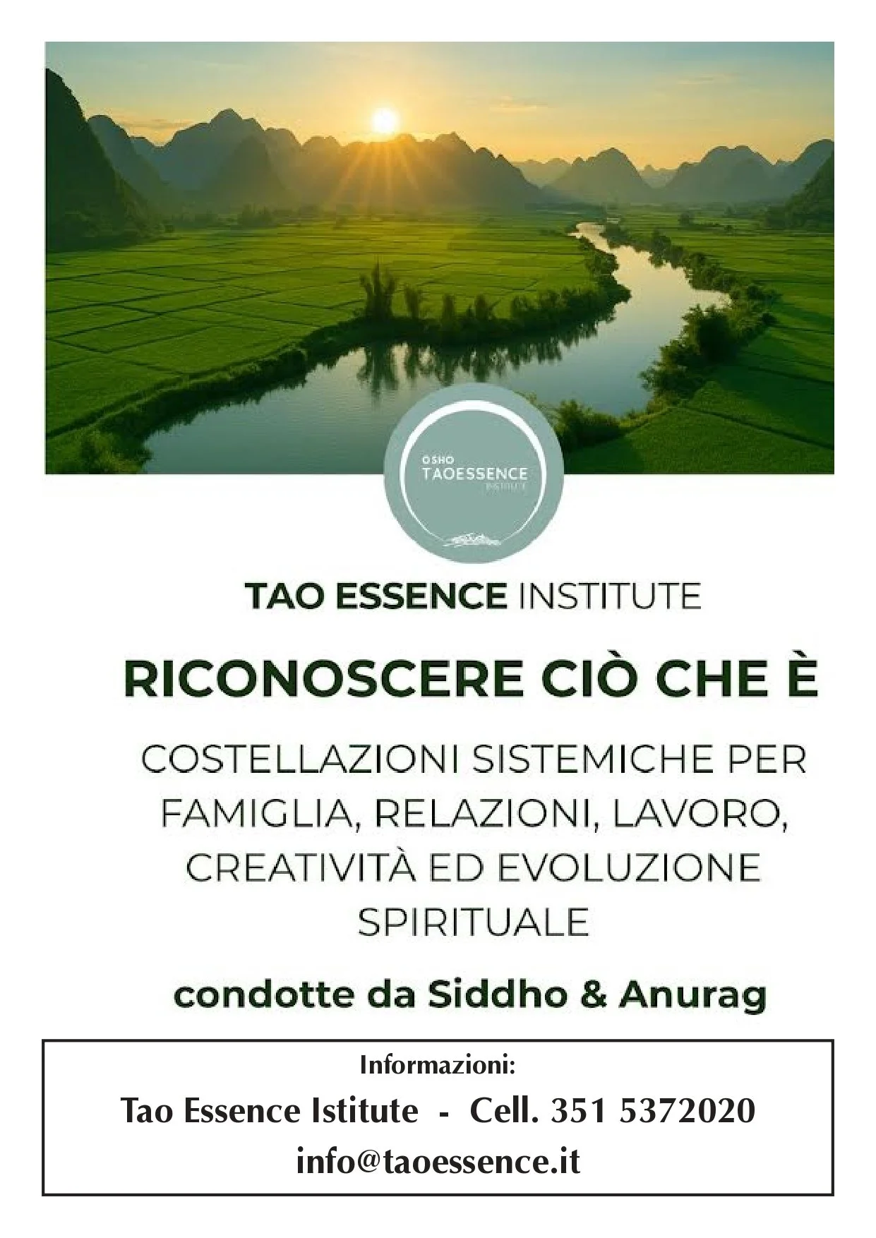 Un seminario di Costellazioni Sistemiche per esplorare famiglia, relazioni, lavoro, creatività ed evoluzione spirituale. “Riconoscere ciò che è” significa portare luce alle dinamiche profonde che ci abitano, osservare con chiarezza ciò che agisce nel nostro sistema e creare spazio per nuovi movimenti interiori. Un’esperienza di consapevolezza e trasformazione condotta da Siddho & Anurag del Tao Essence Institute.